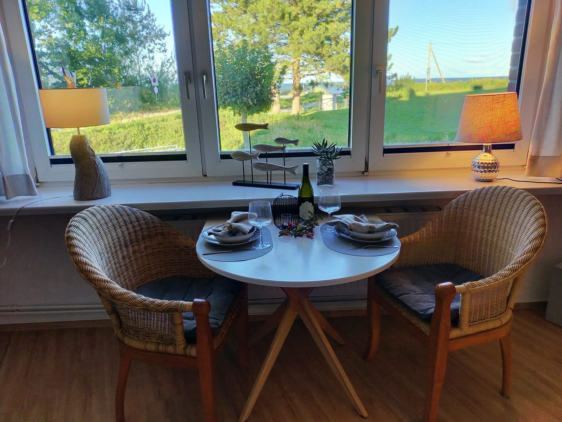 Dein Apartment erwartet dich im 1. OG mit Meerblick aus erster Reihe, ganz egal ob vom Bett mit gemütlicher Leinenbettwäsche, Liegesofa oder beim Frühstück vom Essplatz aus.