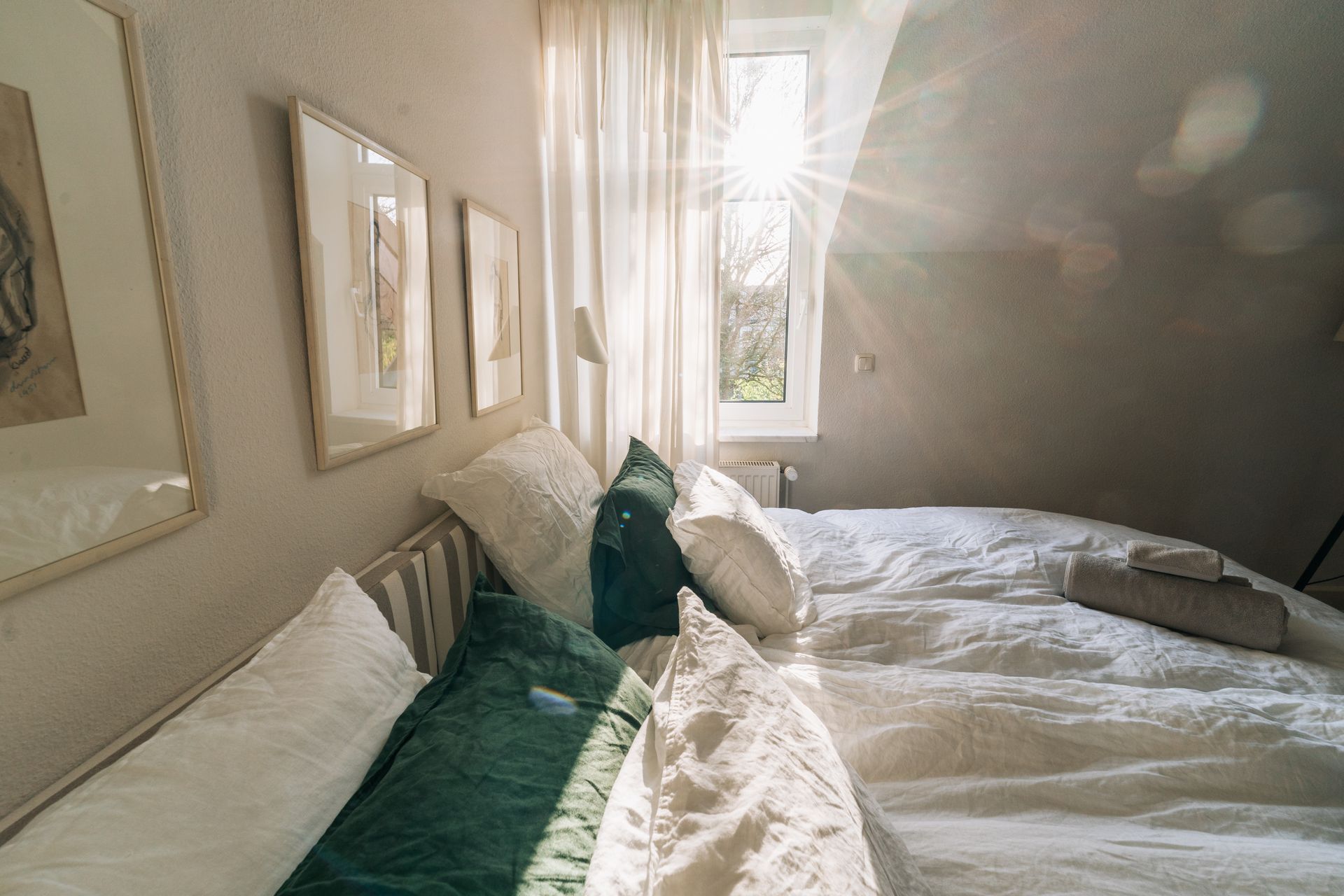 Sehr gut und besonders ruhig lässt es sich in den beiden Schlafzimmern schlafen, die über das untere Schlafzimmer miteinander verbunden sind. Das obere Schlafzimmer, inkl. kleiner Arbeitsecke, erreicht man über eine Leitertreppe. Dieser Auf- und Abstieg sollte bei kleineren Kindern beaufsichtigt werden.
